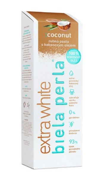 Zubní pasta Biela Perla extra white obsahuje 100% kokosový olej z Filipín, který má antibakteriální účinky s bělicím efektem. Snižuje tvorbu zubního plaku, chrání před tvorbou zubního kamene a před zubním kazem.